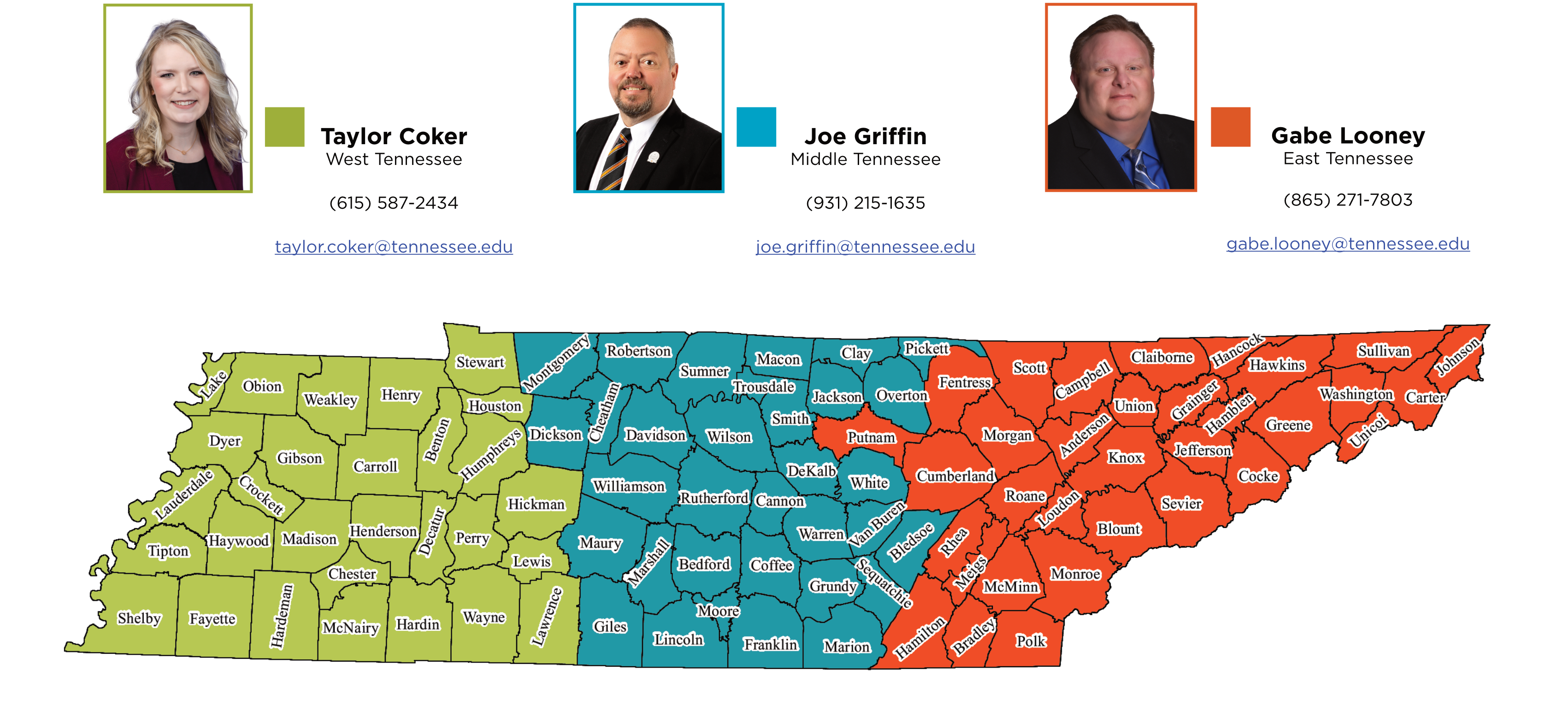 We have a staff devoted to helping county governments in Tennessee receive prompt, accurate technical assistance so they can better serve their citizens. The maps displayed below indicate which staff person is responsible for providing certain technical assistance to various counties.